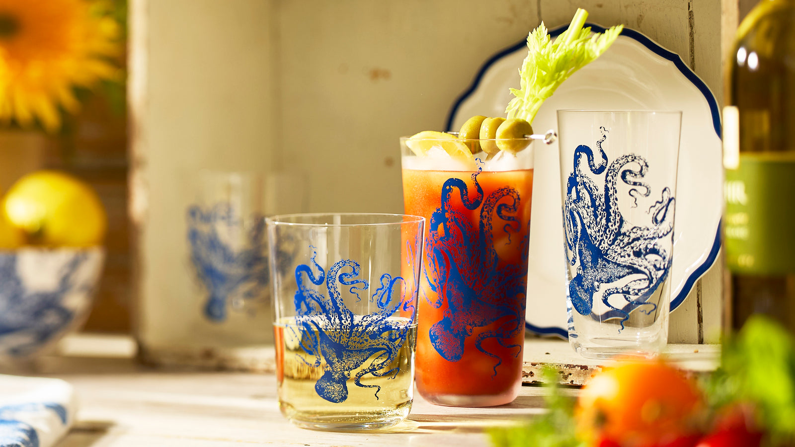 Our fan-favorite cephalopod is carefully sand-etched by hand on this whimsical cocktail collection.