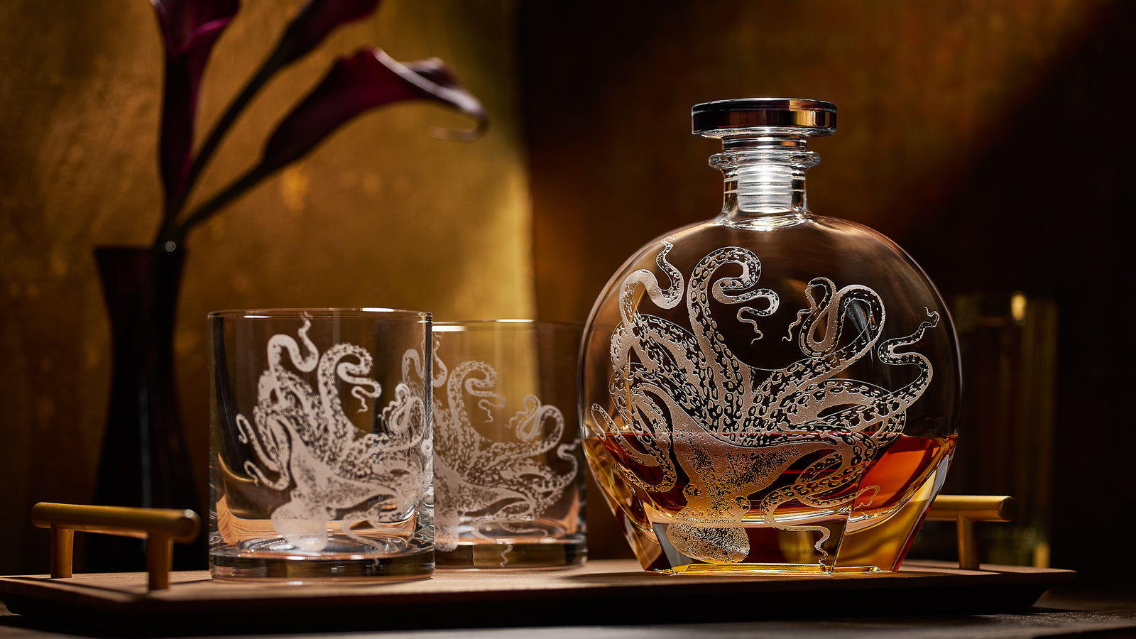 Our fan-favorite cephalopod is carefully sand-etched by hand on this whimsical cocktail collection.