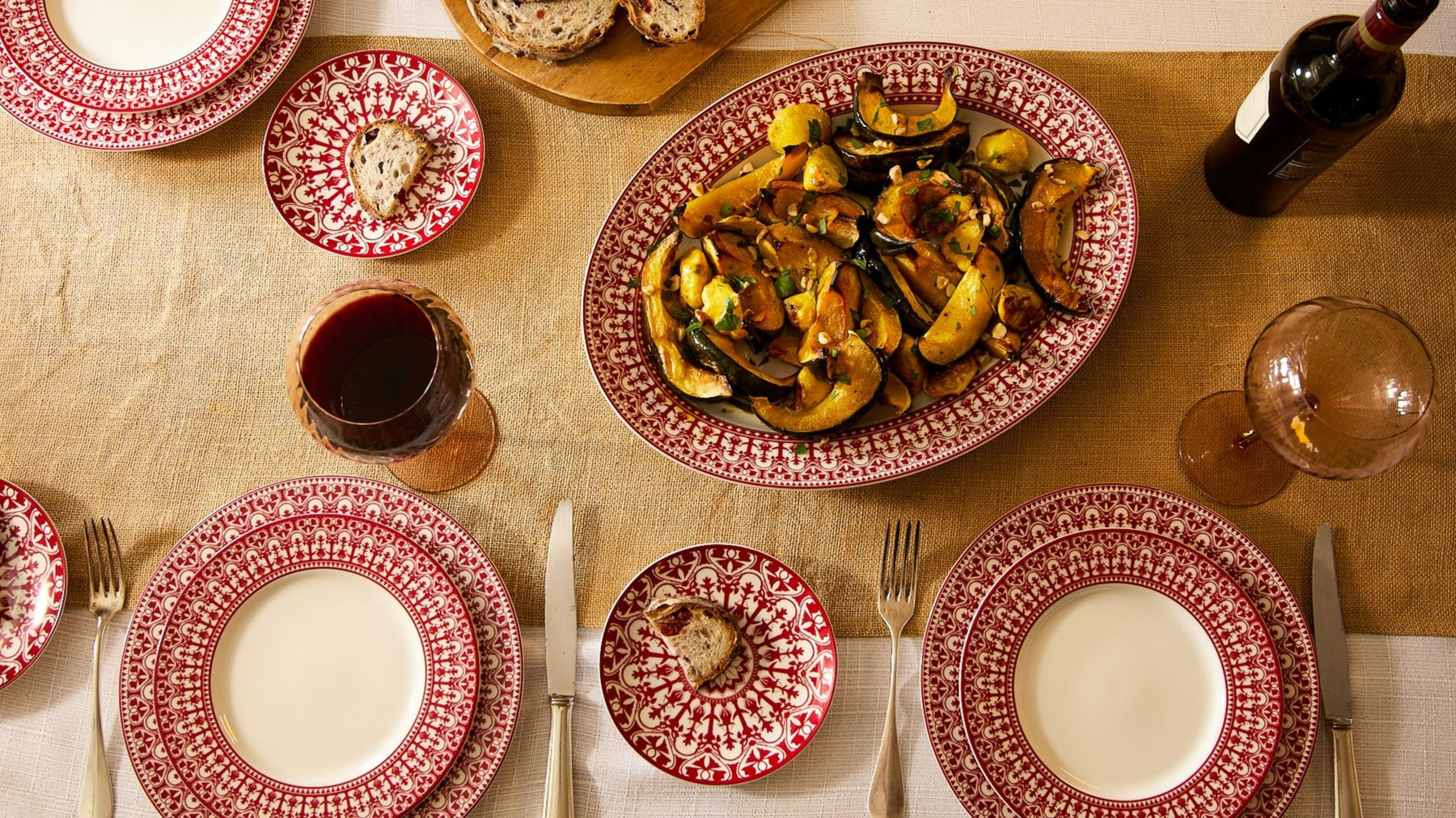 Our beloved Casablanca porcelain dinnerware is re-imagined in a rich crimson for a splash of festive color. Perfect for holidays, it's also great everyday mixed with our white on white dinnerware.