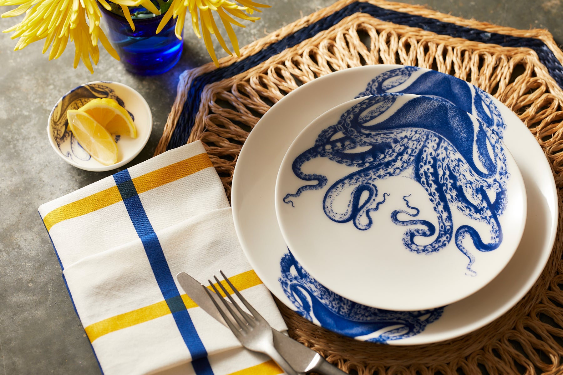 Lucy, our beloved octopus, is clearly in a league by herself. Endlessly playful, this best-selling denizen of the deep has wrapped her arms around our finest creamy white porcelain, glassware and textiles, bringing a sense of deepwater whimsy to the table.