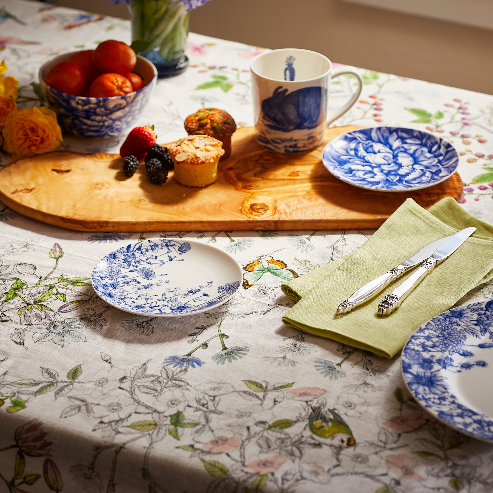 Goodbye winter! Bountiful blooms and garden gate hopping bunnies in rich blues and verdant greens splash across creamy porcelain.