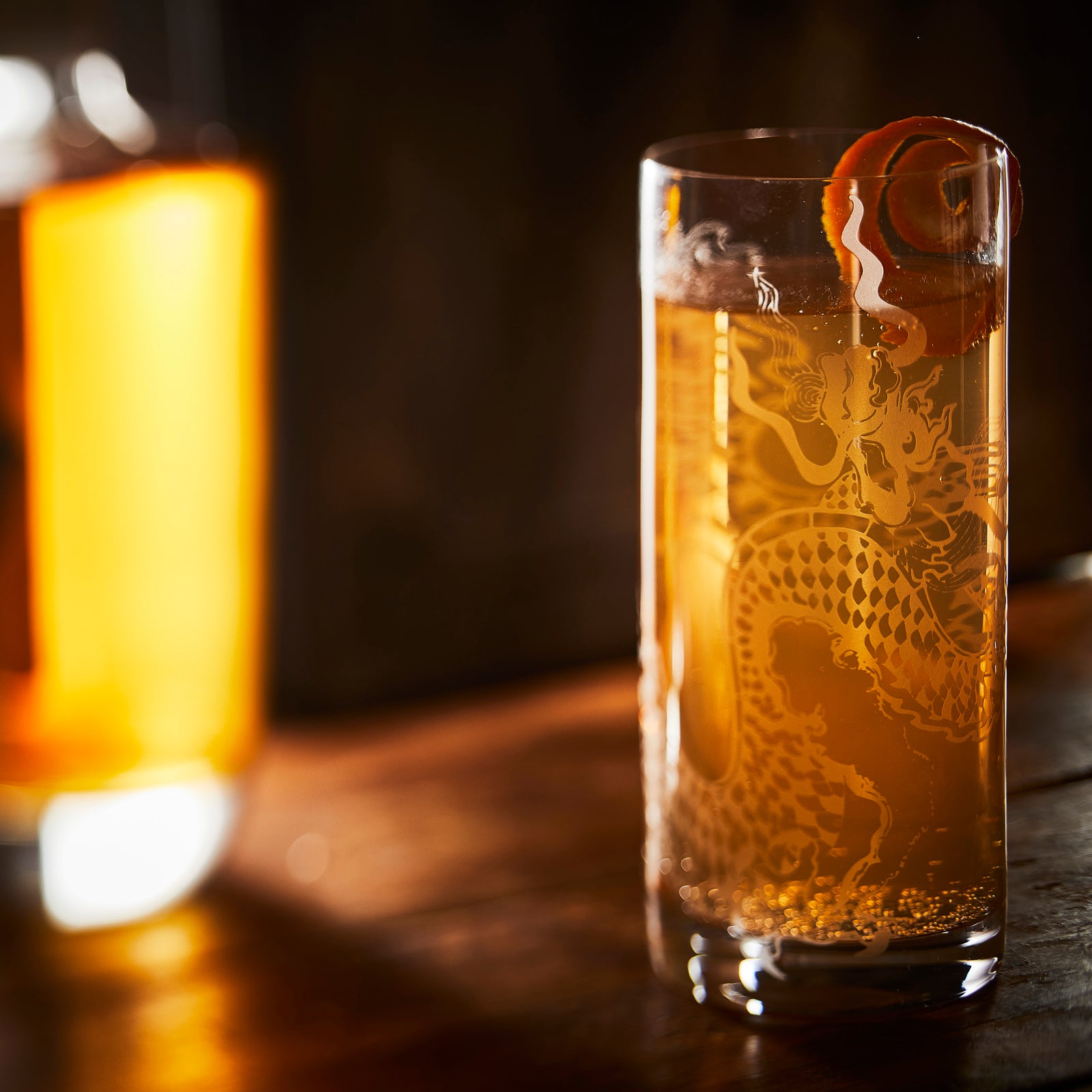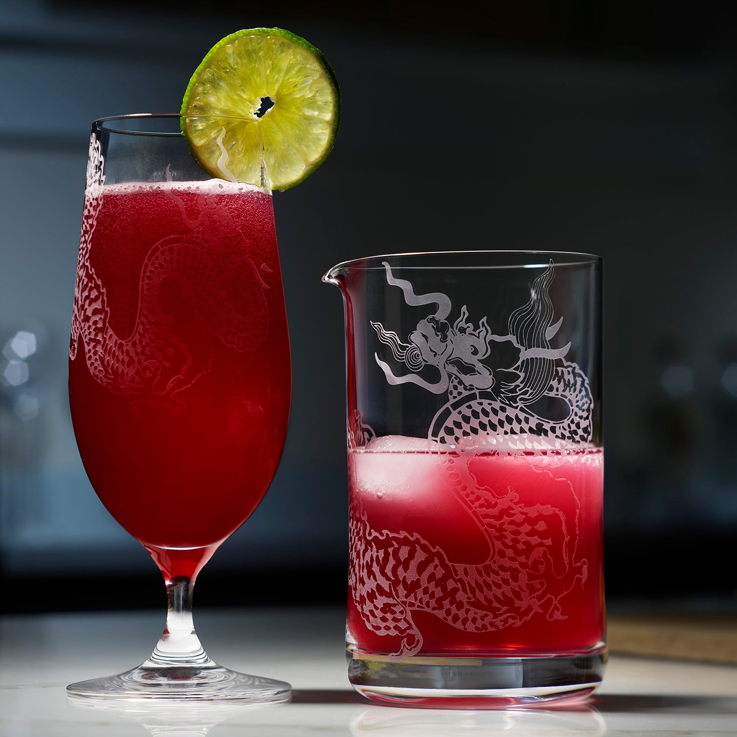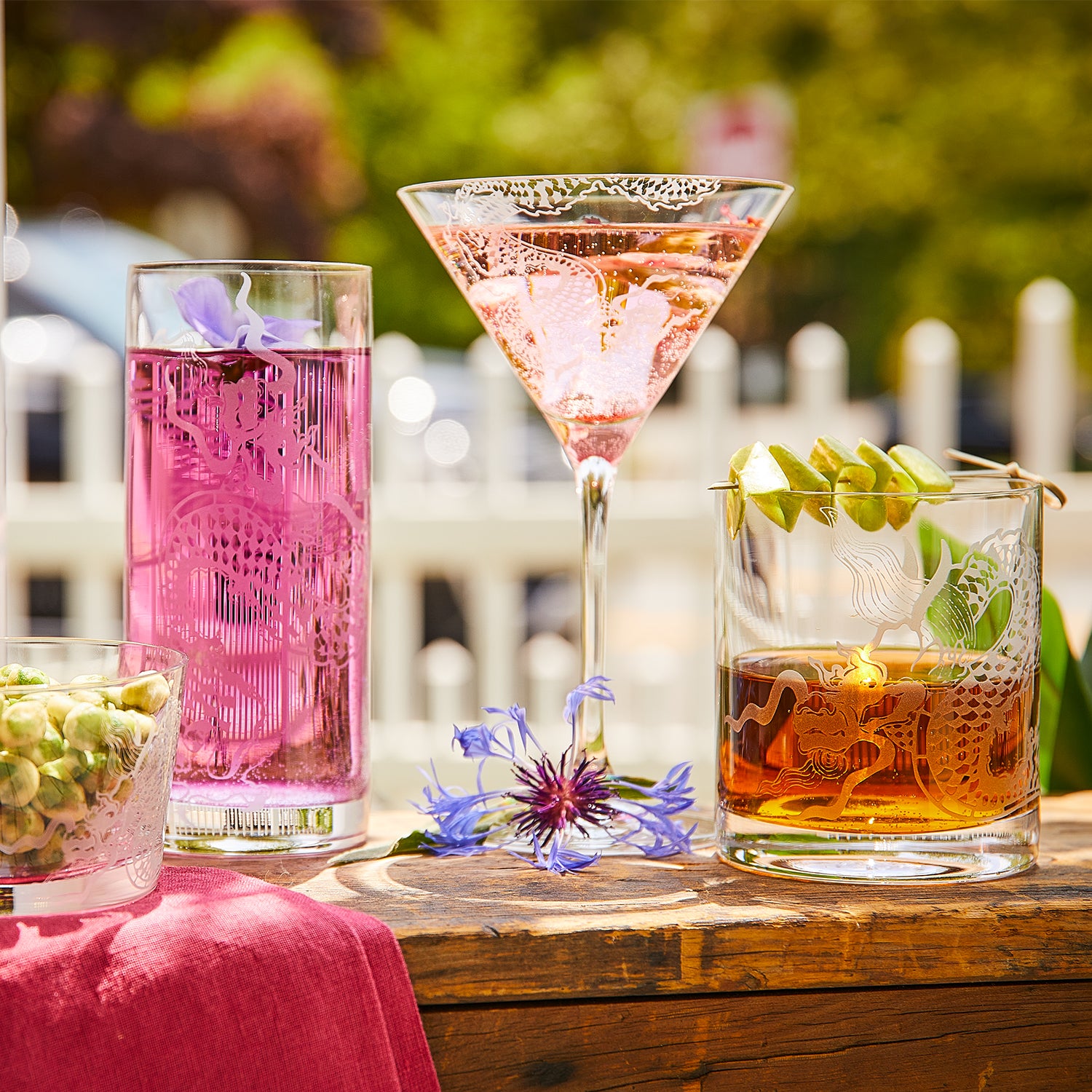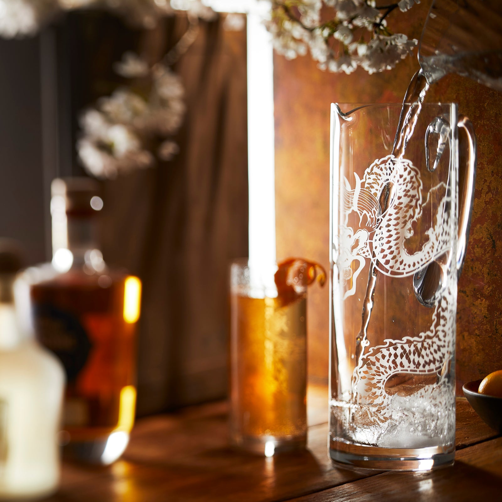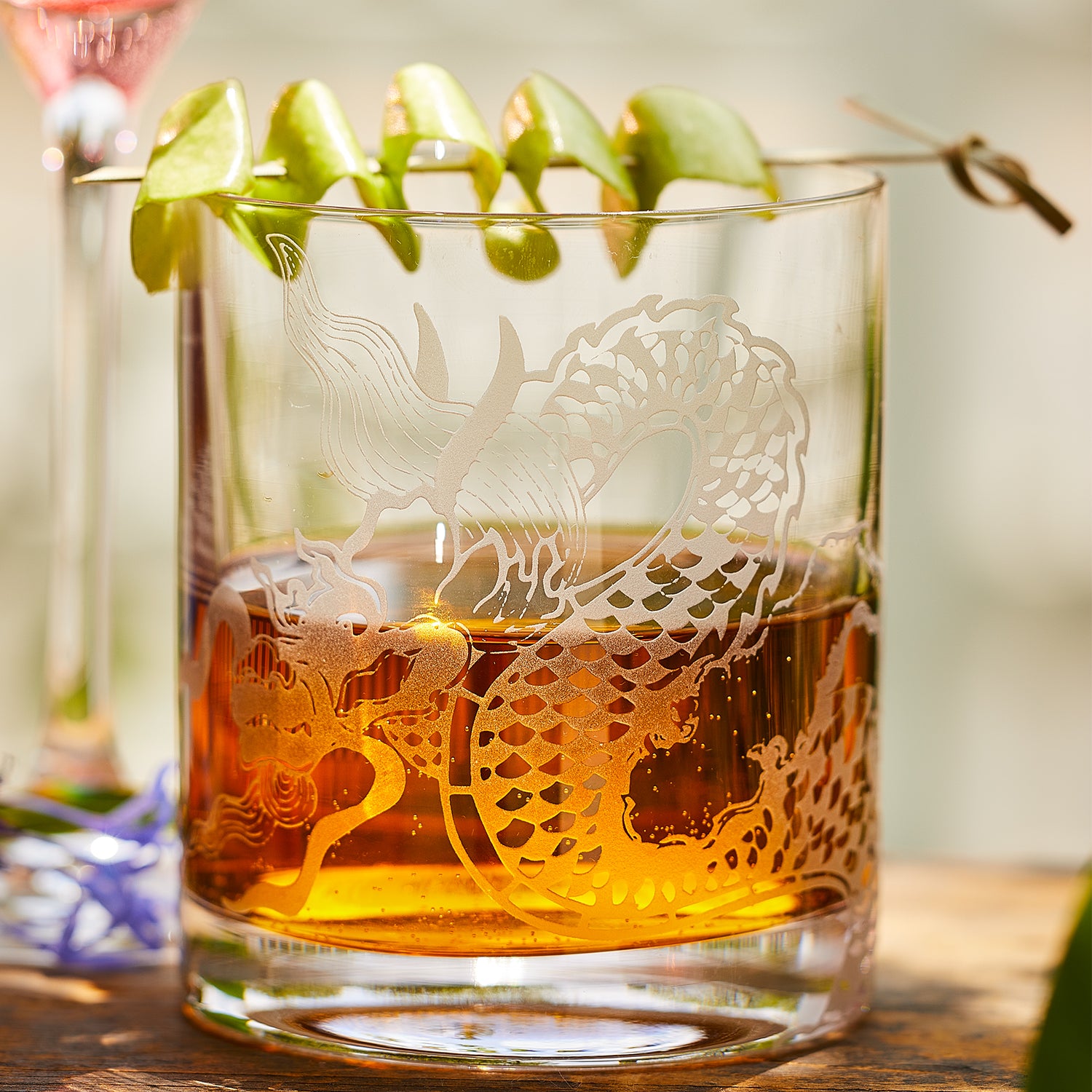 Sparkling crystal sand-etched with our handsome, lyrical dragon brings a little attitude to happy hour.