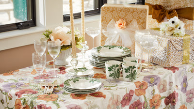 Stella dinner plates, this bundle is tailor-made for those who love to mix style and functionality. Whether you're serving a casual breakfast or hosting a dinner party, these plates and playful School of Fish napkins add a splash of fun to your table.
