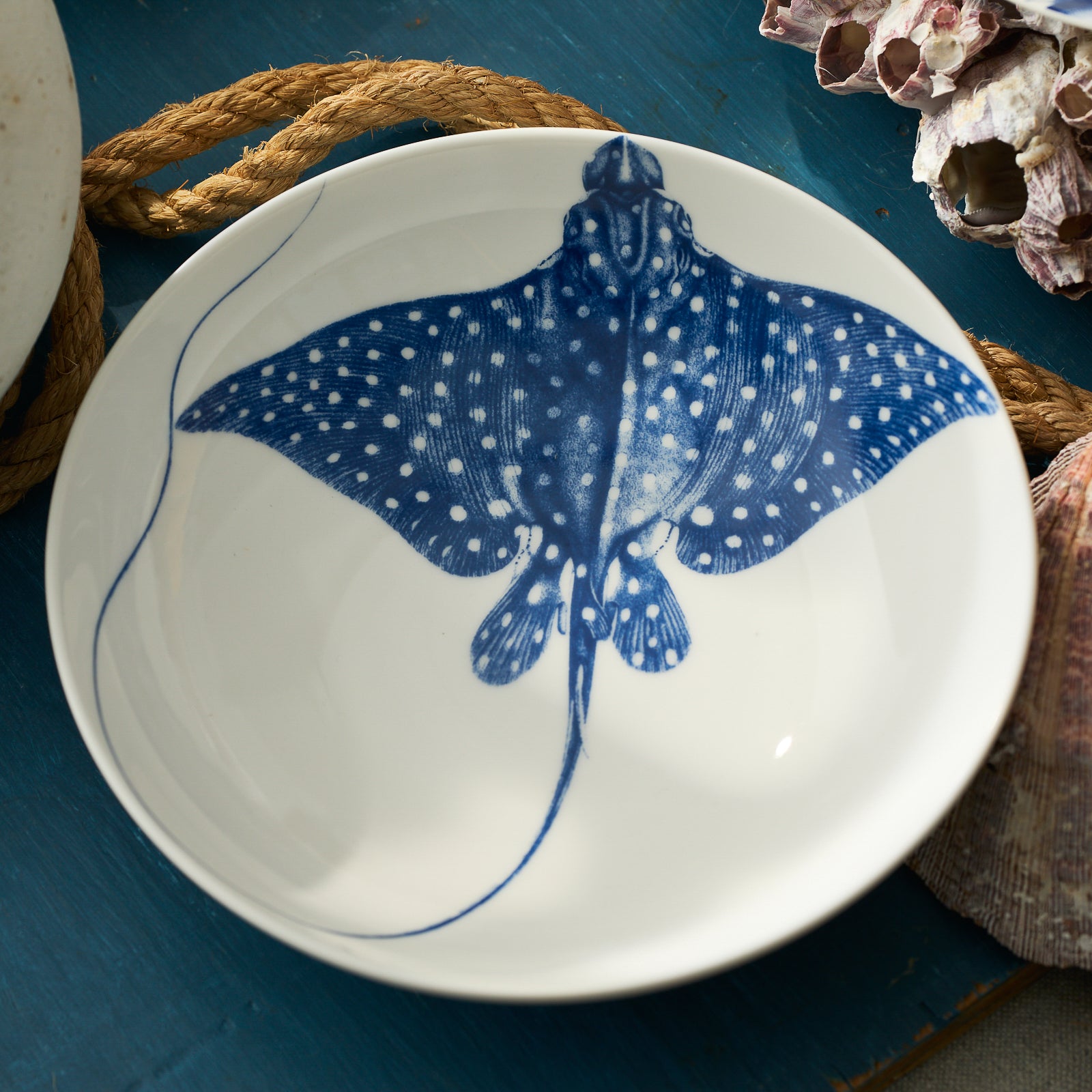 Our newest sea creature, Ray- is a smooth operator and a stylish new addition to our coastal collection. This striking stingray swims across our creamy white porcelain entrée bowl, adding a dose of panache polka dots to the party in classic blue and white.